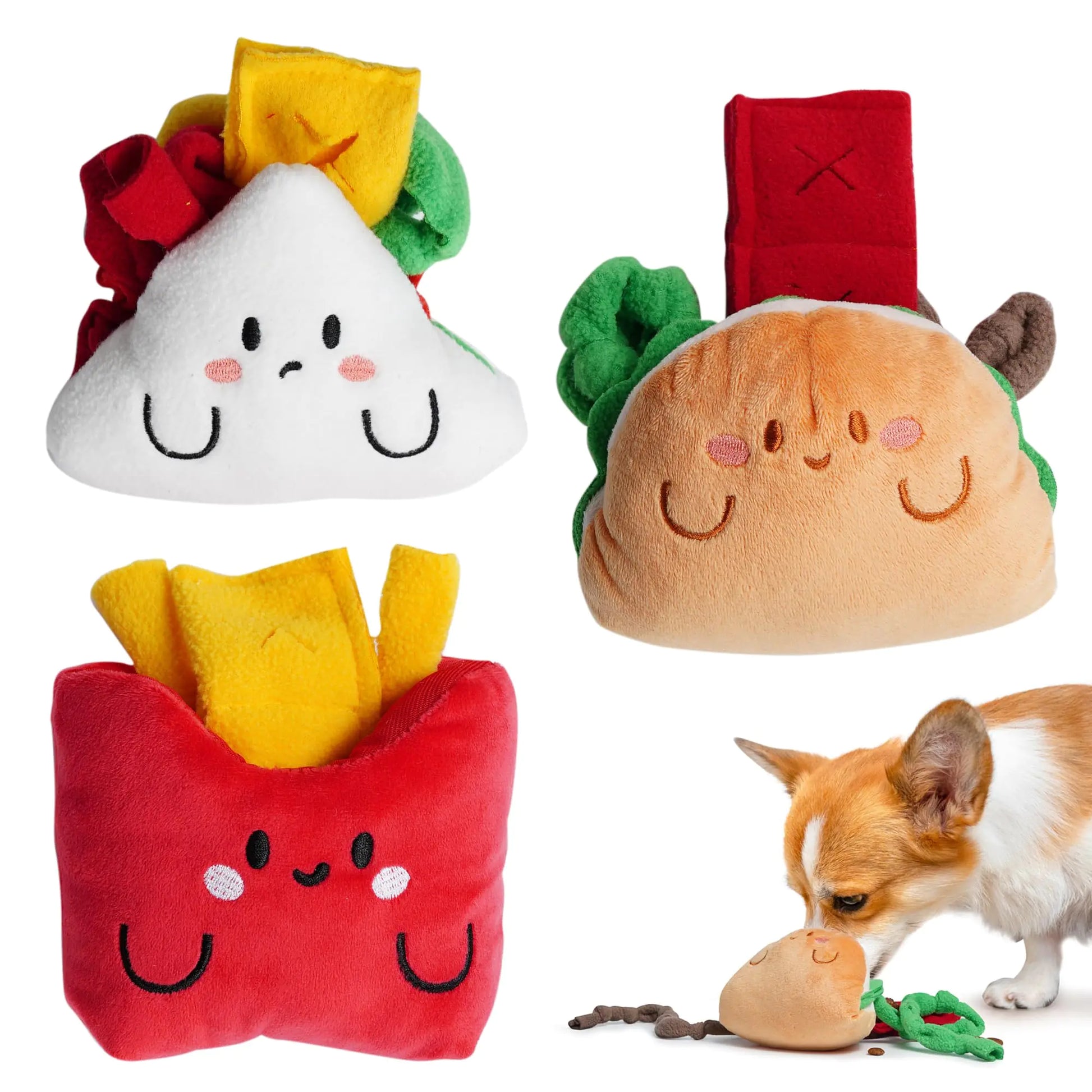 [Fun and Cute Design: This interactive dog toy features three charming food shapes— a yellow taco a white sandwich and a red french fries. Each toy features vibrant and endearing expressions offering dogs a unique interactive encounter. Engage in Hide-and-Seek Fun: Each toy features three food hiding pockets of varying sizes. Train your dog to search for food and stimulate their foraging instincts by placing treats in these pockets or inside the toy. Promote Healthy Play: Our 3 pack food toys facilitates interactive keeping your pet busy and helping them effectively consume excess energy. "Squeaky & Relieving Boredom: This puzzle dog toy contains internal squeakers and crinkle papers producing irresistible sounds when chewed or touched. This captivates your dogs interest alleviating boredom effectively." "Material & Suitable Pets: This small dog toy is crafted from gentle cotton fabric ensuring a safe chewing and playing experience for your pet. Designed for small to medium-sized dogs its not suitable for aggressive chewers. We recommend closely monitoring power chewers to prevent them from pulling out the squeakers during vigorous play."]
